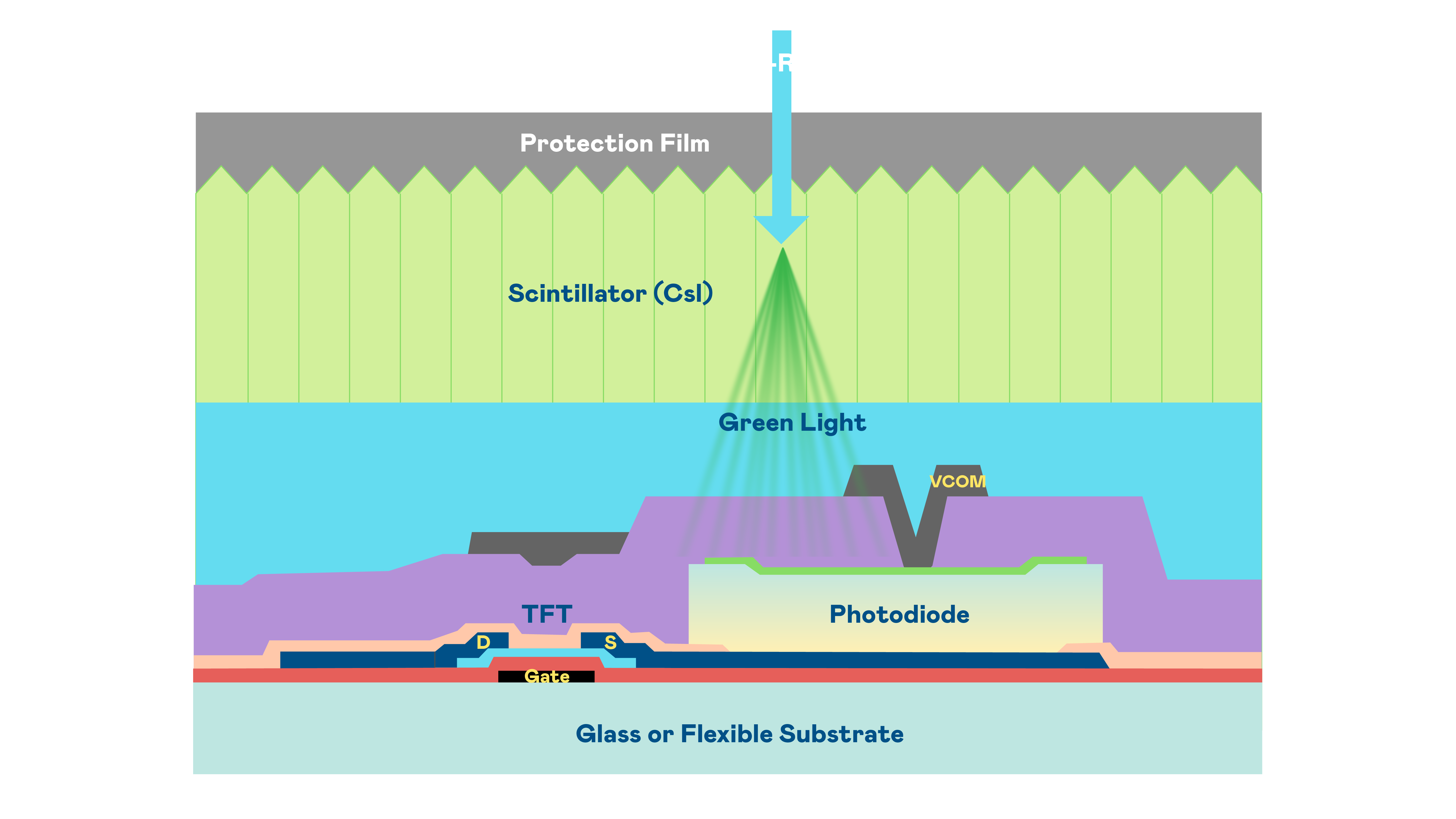 asiagame的X光影像感測陣列使用薄膜電晶體 (TFT) 作為每個像素的讀取開關,搭配光電二極體(Photodiode)的光電轉換元件,用以感測X光影像訊號。
